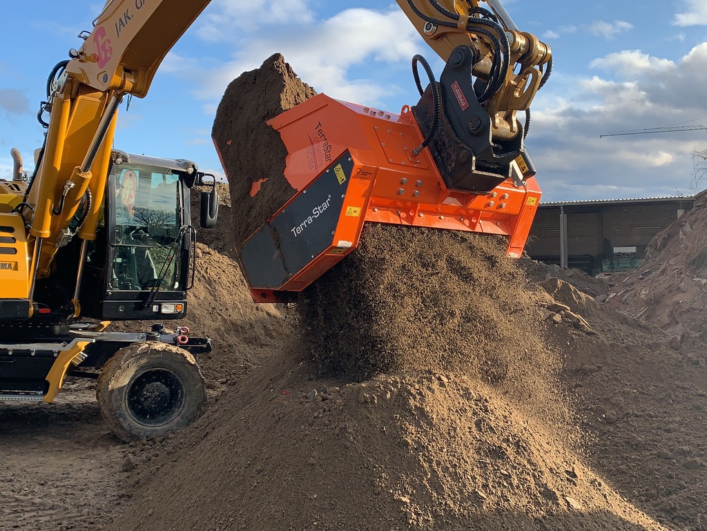 Der Terra-Star® ist speziell für den professionellen Einsatz und hohe Dauerleistung konzipiert und kann als Anbaugerät für Hydraulikbagger und Radlader verwendet werden. Seine horizontalen Wellen sind in geschlossenen, wartungsfreien Lagereinheiten gelagert und davor geflanscht. Mit dem Terra-Star® können Sie sieben, trennen, mischen, belüften und zerkleinern.