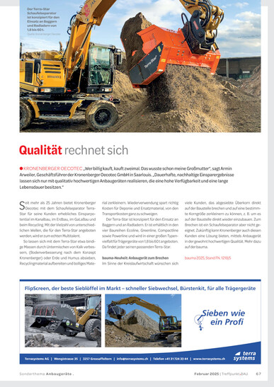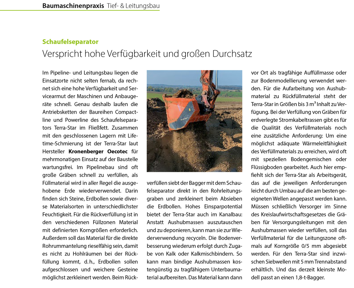 KRONENBERGER OECOTEC „Die Anschaffung der drei Terra-Star war eine meiner besten Entscheidungen" sagt Carsten Balan, Geschäftsführer der Firma Balan GmbH in Datteln. „Mit dem zuletzt angeschafften Terra-Star POWERLINE haben wir nun auch das richtige Gerät für unsere schweren Kettenbagger", so Balan weiter. Die Firma Balan ist ein mittelständischer Garten- und Landschaftsbau Betrieb und hat sich in den vergangenen Jahren ein zusätzliches Standbein geschaffen...