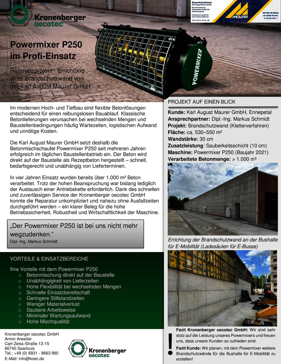 KRONENBERGER OECOTEC Ein Kunde berichtete dem Kronenberger Oecotec Fachhändler MH-Gabler in Lupburg (Bayern) kürzlich, dass er die Betonmischschaufel „POWERMIXER“ auf der Baustelle eines Berufskollegen in Aktion gesehen hatte. Von der einfachen Handhabung und Zuverlässigkeit des Geräts war der Kunde so beeindruckt, dass er für sein eigenes Unternehmen ebenfalls einen Powermixer erwarb...